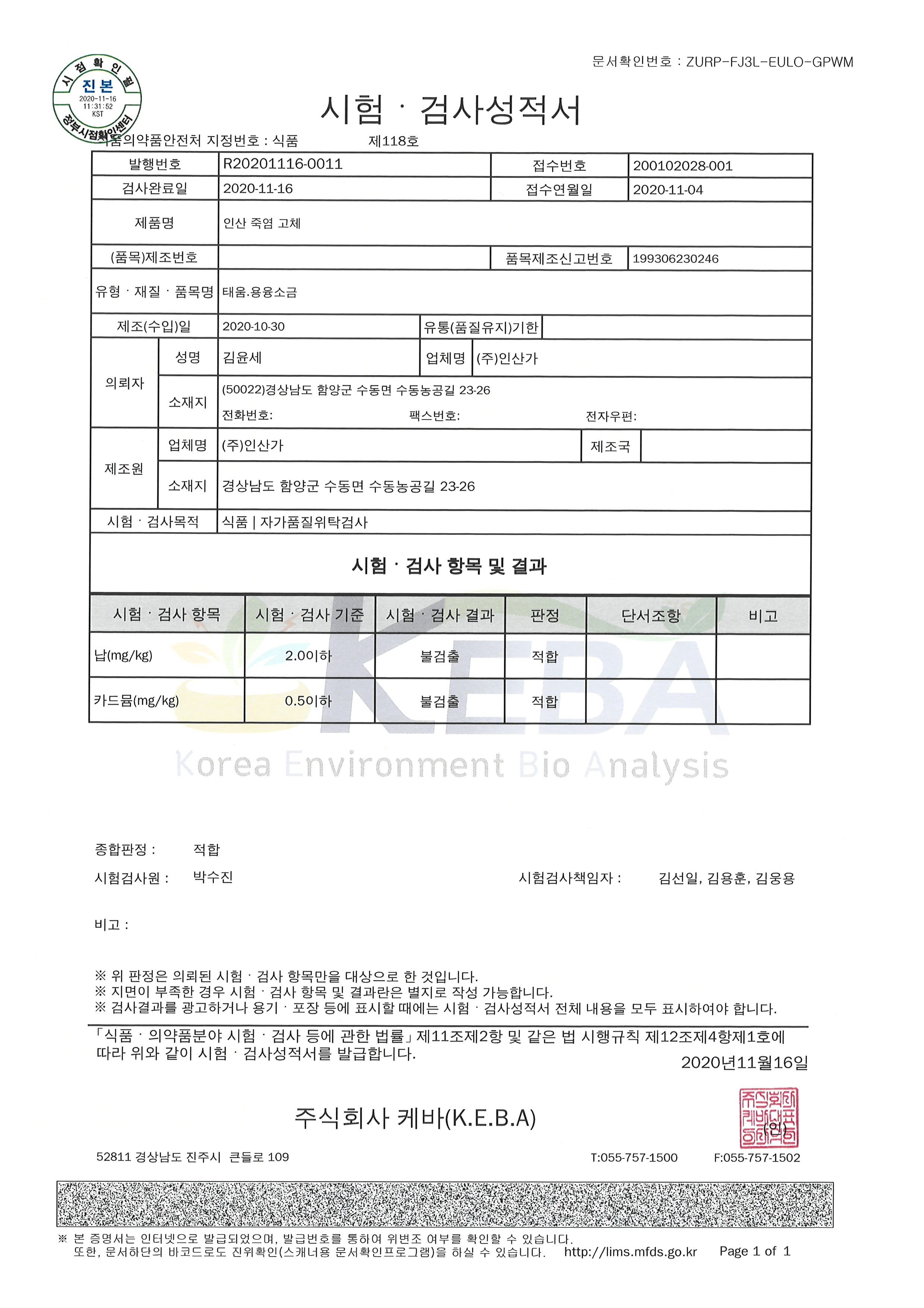 죽염고체 품질검사성적서 주식회사 케바(K.E.B.A)
